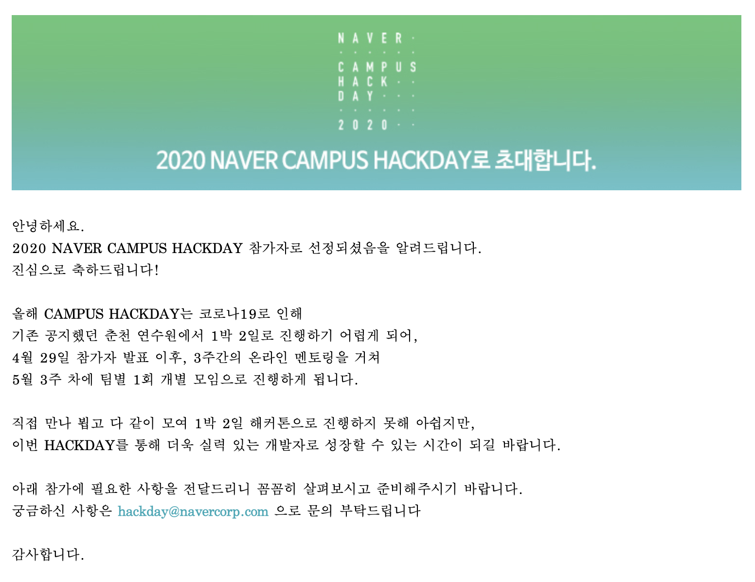 네이버 핵데이는 웹 개발에 관심을 가지게 된 2017년도부터 쭉 도전해보고 싶었지만, 지원자격에서 요구하는 기술 경험이 없어서 늘 지원을 망설였던 활동이다. 하지만 2020년의 나에겐 좀 달랐다. 개인 프로젝트를 통해 경험을 쌓은 덕인지, 지원자격을 살펴보는데 "오, 이 정도면 한 번 지원해볼만 하다"라는 자신감이 생겼고 지원을 결심하게 되었다.